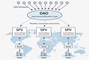 DAO Participants → DAO (Governance Layer) → DAO Fund (Treasury) → SPVs (Multiple Jurisdictions) → Real Estate Assets